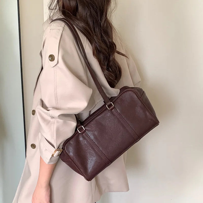 2025 New Leather Boston Bag Women Large Capacity Bowling Shoulder Handbag Minimalist Style