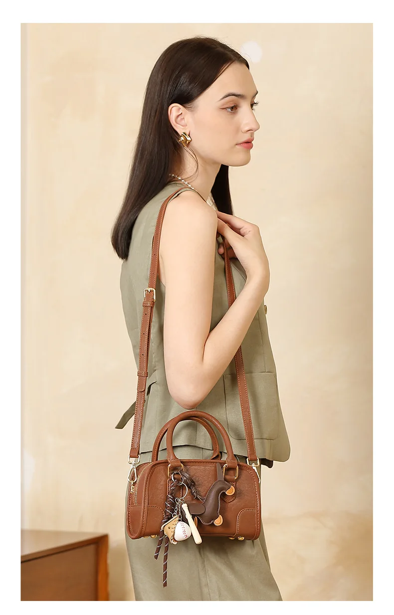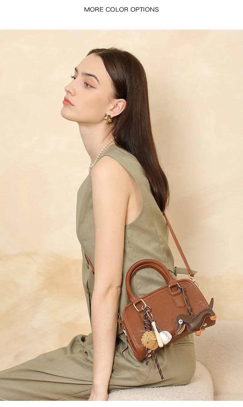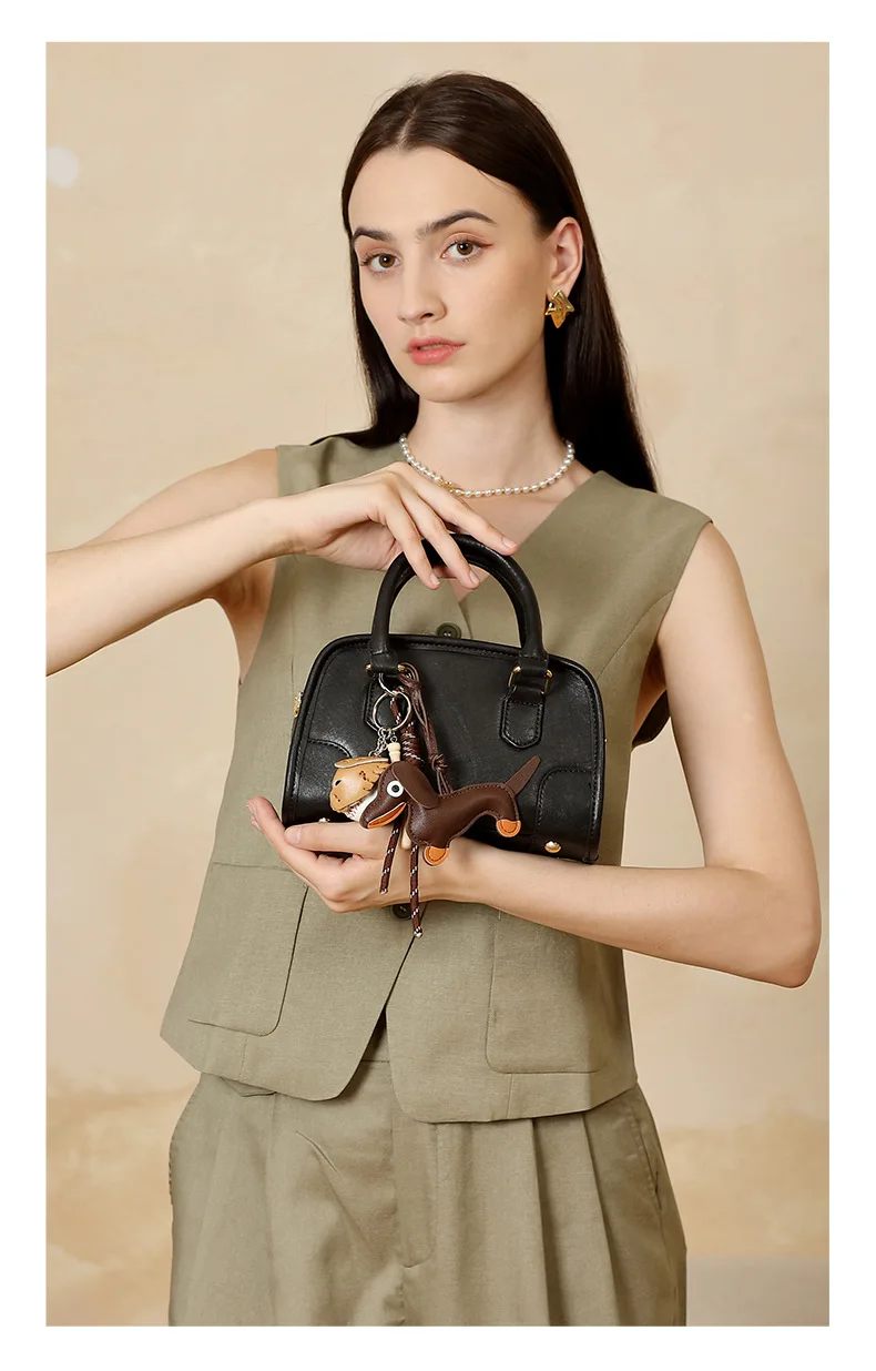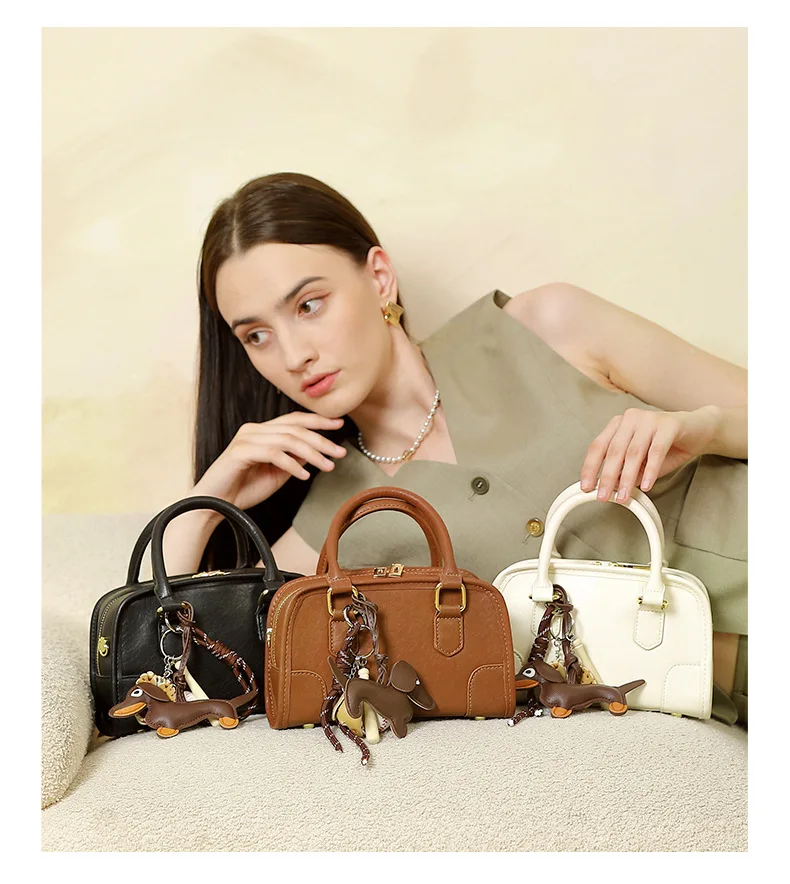 Cowhide Bowling Bag Women's Handbag Genuine Leather Boston Bag Shoulder Crossbody Bag Ladies Purses and Handbags