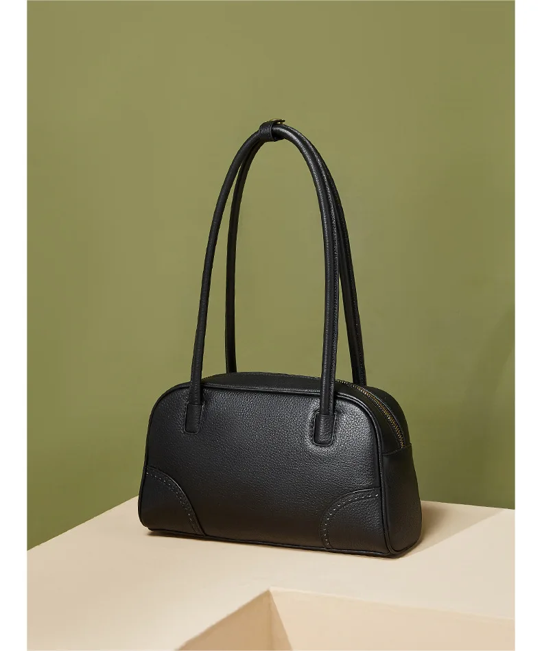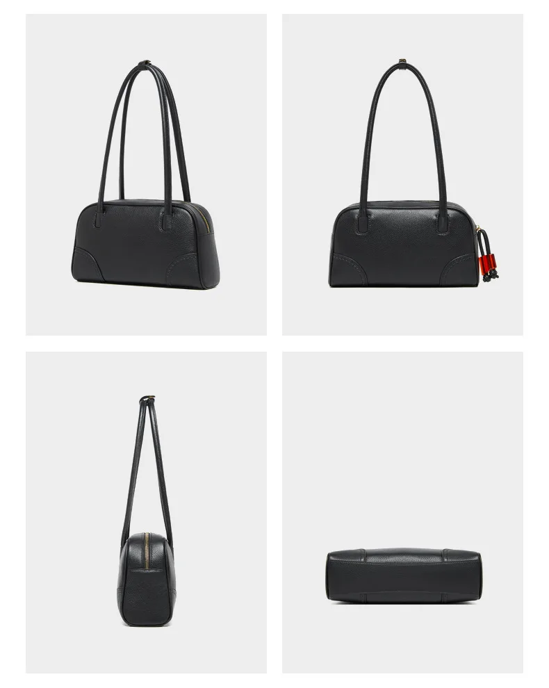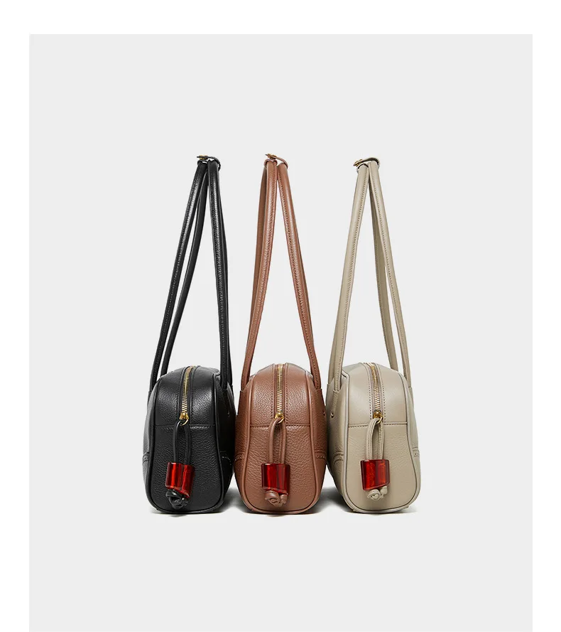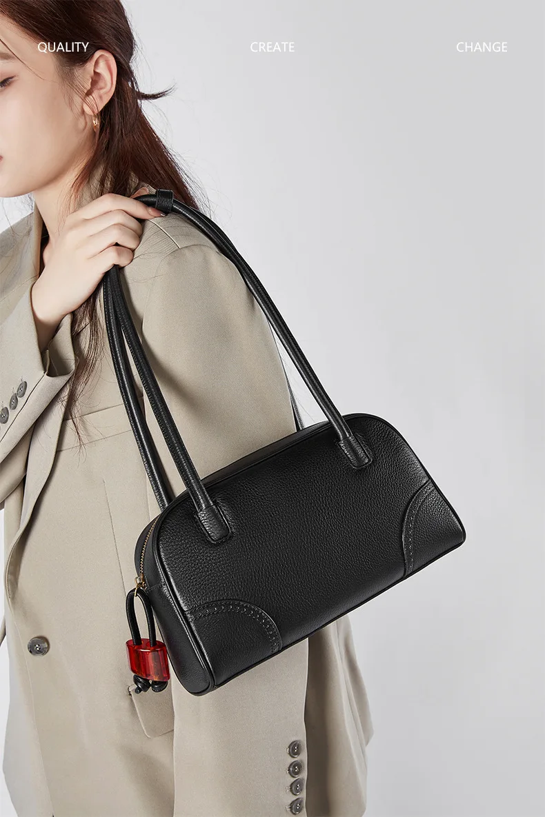 Women Vintage Genuine Leather Handbag Large Capacity Shoulder Underarm Tote Bowling Bag for Daily Use